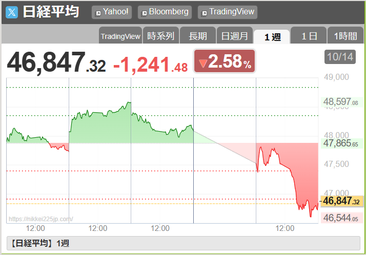 まず株式。東京市場は朝から大きく売られ、日経平均は一時-2.6%前後まで下落しました。