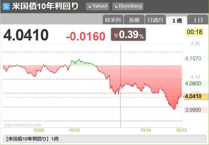株が不安定になると、相対的に安全とされる国債へ資金が逃げやすく、その結果として米10年金利はおおむね4.0%前後まで低下しています。
