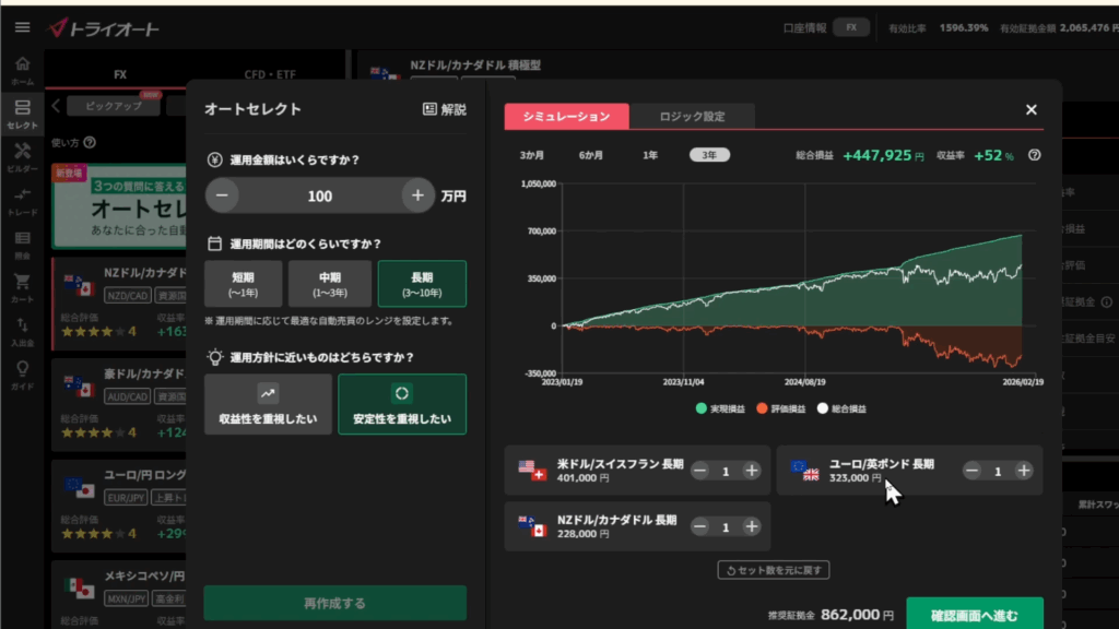 この3つの質問に答えるだけで、プロが考えた高度なロジックを組み合わせた「最適な自動売買プラン」を勝手に作成してくれるんです。