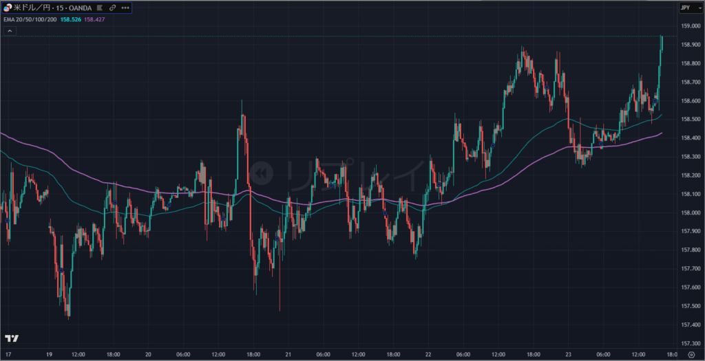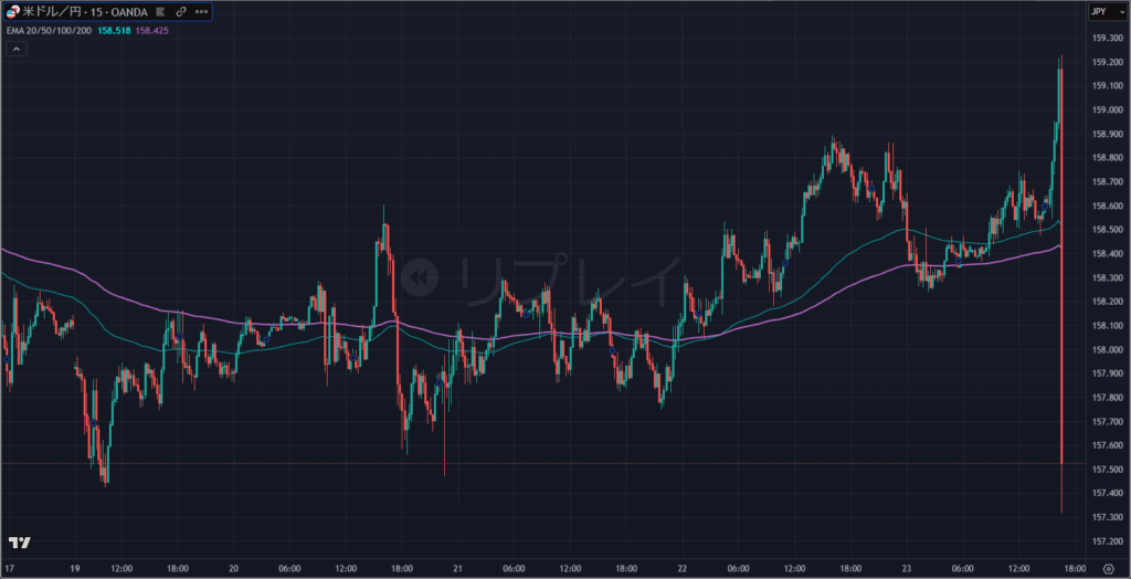 日本市場での急落後、相場は一旦落ち着きを取り戻し、158円台でのもみ合いが続いていました。しかし、本当の衝撃はニューヨーク市場の午後に待っていました。