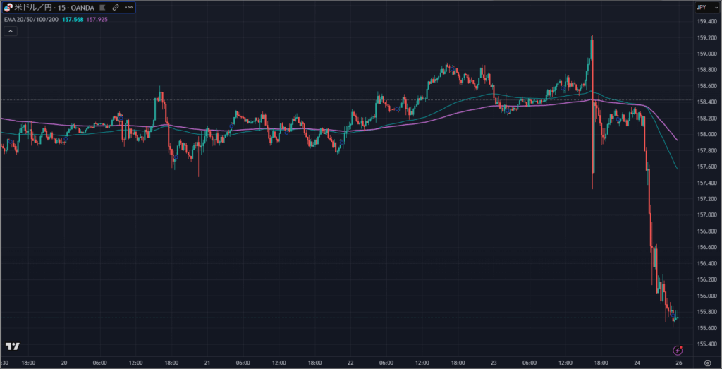 この報道を受け、ドル円はわずか数分のうちに159円台から157円台前半へと、約2円もの急落を見せました。
