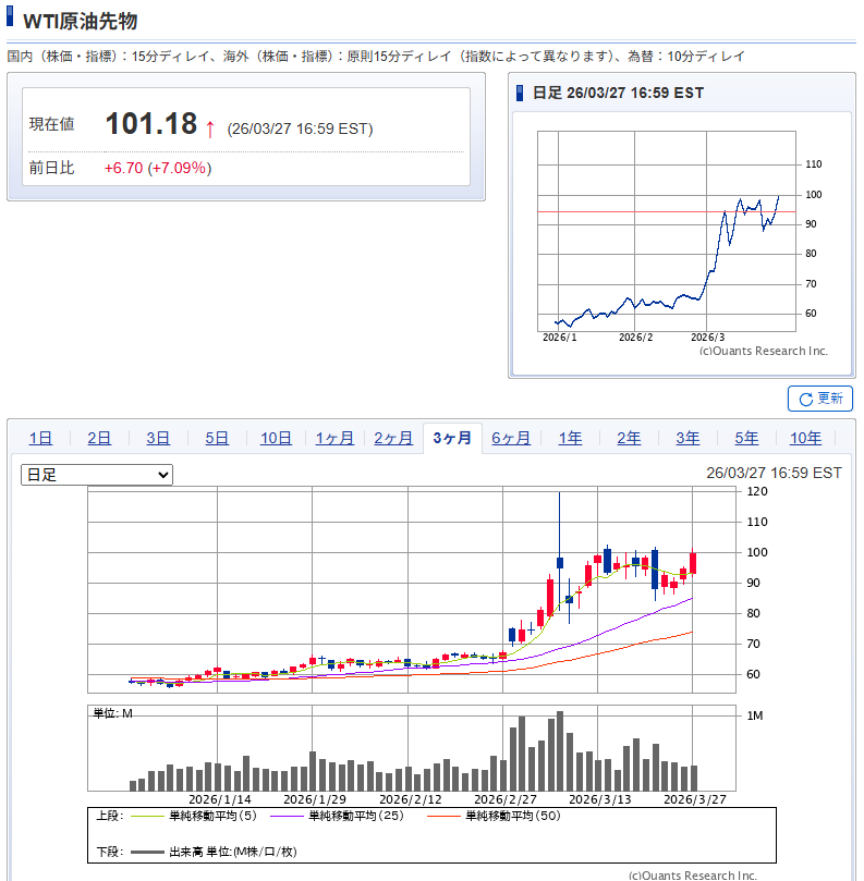 この水路が事実上の封鎖状態に追い込まれたことで、紛争が始まって以来WTI原油価格は約40%上昇しており、原油先物価格は3月27日に再び一時1バレル100ドルを突破しました。